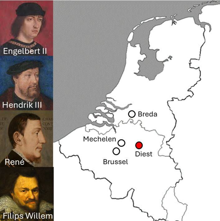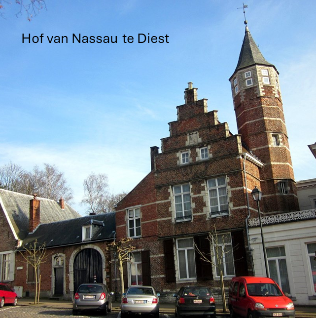 De Bredase blik richt zich naar het zuiden! Deel 2: Diest. De roemrijke Bredase tak van het huis Nassau bezat stadspaleizen in vier steden in het oude hertogdom Brabant: in thuisstad Breda, in Mechelen, in Diest en in Brussel. In 1499 kwam Engelbert II van Nassau middels een ruil van een aantal van zijn Duitse grondgebieden in het bezit van het Brabantse stadje Diest. Engelberts opvolger Hendrik III van Nassau renoveerde de in Diest aanwezige burcht waarvan tegenwoordig de linkervleugel plus een achthoekige toren nog overeind staan. Ook liet hij vlakbij een park aanleggen dat diende als jachtdomein. Hendriks zoon René ontving in dit ‘Hof van Nassau’ de landsheer keizer Karel V die een week bleef logeren. Na het overlijden van René diende het stadspaleis als residentie van diens weduwe Anna van Lotharingen waardoor René’s erfgenaam Willem van Oranje-Nassau nooit in Diest heeft verbleven. Uiteindelijk kwam het Hof van Nassau in bezit van Willems oudste zoon: Filips Willem van Oranje-Nassau. Die vond na een turbulent leven (hij verbleef in de Tachtigjarige Oorlog als gijzelaar in Spanje) zijn laatste rustplaats in Diest. Het huidige Belgische stadje Diest met zijn bourgondische centrum, het hof van Nassau (Graanmarkt) en het graf van Filips Willem (Sint Sulpitiuskerk) is een bezoekje meer dan waard. Dus volg het spoor van de Bredase Nassaus en ga richting het zuiden!