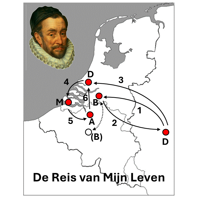 Vader des vaderlands Willem van Oranje werd in 1533 geboren in het Duitse plaatsje Dillenburg. (1) Op zijn 11e verhuisde hij naar Brabant om zijn neef René op te volgen als heer van Breda en om van hem de titel Prins van Oranje te erven. Gedurende de volgende 23 jaar was het kasteel van Breda het thuis van Willem en zijn gezin. Nergens woonde hij zo lang. Geregeld reed Willem voor zijn werk heen en weer naar Brussel waar hij een werkpaleis bezat. Toen in 1567 een vijandig Spaans leger de Lage Landen binnenviel (2) vluchtte Willem met zijn gezin naar zijn ouderlijk huis in Dillenburg waar hij vijf jaar zou verblijven. Nadat de geuzen in 1572 Den Briel hadden veroverd en de Spaanse vijand daarop niet reageerde (3) keerde Willem terug naar de Lage Landen om vanuit Delft gedurende drie jaar de situatie aan te kijken. Toen de Spaanse legers zich in 1575 terugtrokken (4) zakte Willem voorzichtig via Middelburg, waar hij twee jaar verbleef, af naar (5) Antwerpen waar hij zes jaar woonde. In het laatste jaar van zijn leven doemde vanuit het zuiden het Spaanse gevaar weer op en (6) verkaste Willem naar Delft waar hij in 1584 werd vermoord.